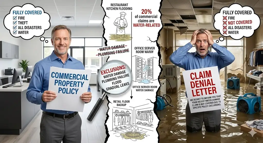This is where coverage gaps become genuinely treacherous. Standard commercial property policies routinely exclude flood damage — sometimes even when the flood originates from an internal plumbing failure rather than a natural weather event. That exclusion language is easy to miss and catastrophically expensive to discover at claim time.
